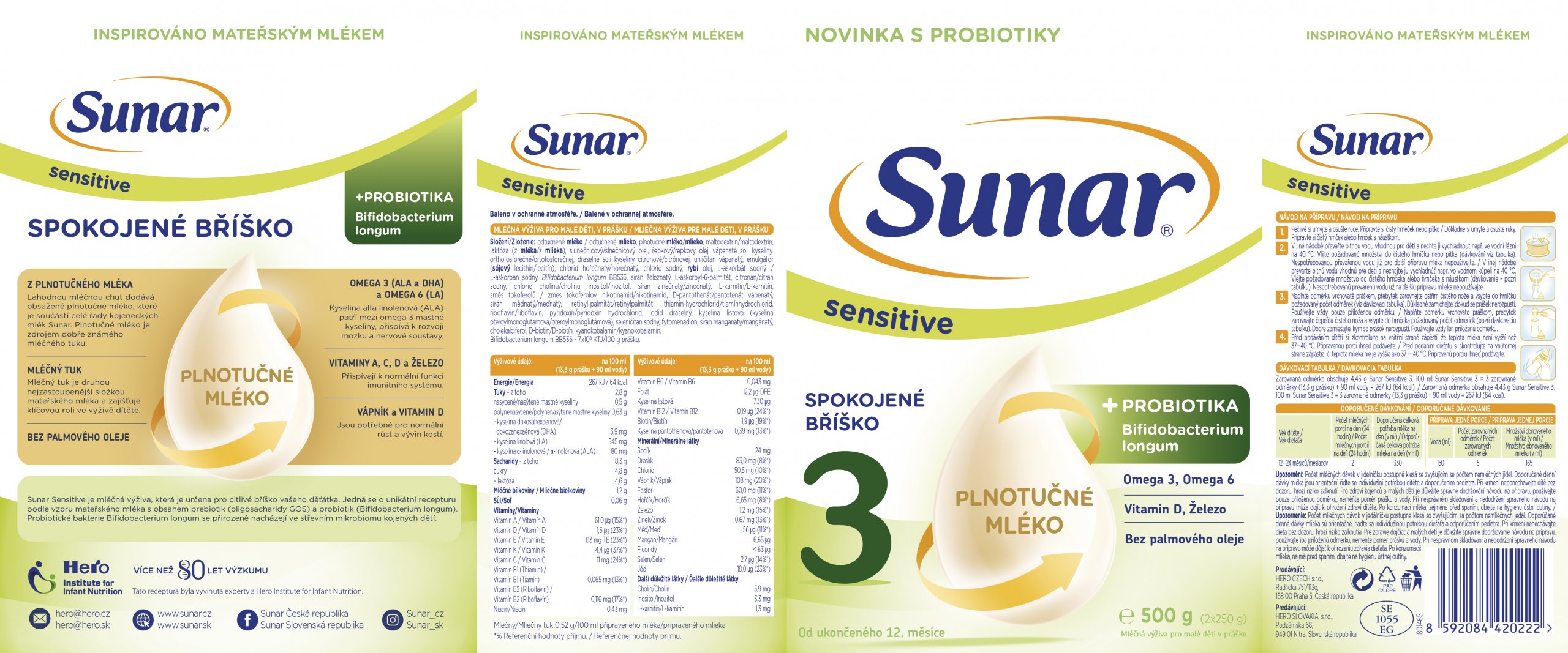 Odtučnené mlieko, plnotučné mlieko, maltodextrín, laktóza (z mlieka), slnečnicový olej, repkový olej, vápenaté soli kyseliny ortofosforečnej, draselné soli kyseliny citrónovej, uhličitan vápenatý, emulgátor (sójový lecitín), chlorid horečnatý, chlorid sodný, rybí olej, L-askorban sodný, Bifidobacterium longum BB536, síran železnatý, L-askorbyl-6-palmitát, citran sodný, chlorid cholínu, inozitol, síran zinočnatý, L-karnitín, zmes tokoferolov, nikotínamid, D-pantotenát vápenatý, síran meďnatý, retinylpalmitát, tiamínhydrochlorid, riboflavín, pyridoxín hydrochlorid, jodid draselný, kyselina listová (kyselina pteroylmonoglutámová), seleničitan sodný, fytomenadion, síran mangánatý, cholekalciferol, D-biotín, kyanokobalamín.