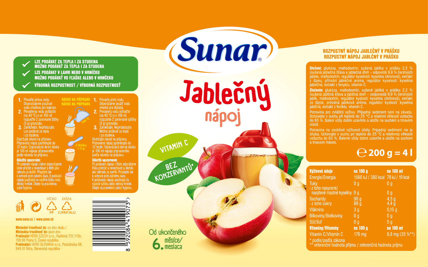 - Glukóza, maltodextrín, jablkový prášok 2,2 % (sušená jablková šťava a jablková dreň – zodpovedá 9,9 % čerstvých jabĺk, maltodextrín, regulátor kyslosti: kyselina citrónová), šípkový extrakt, prírodná jablková aróma, regulátor kyslosti: kyselina jablková,